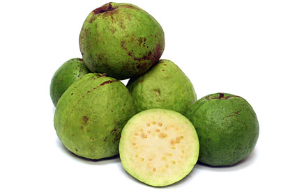 An exotic fruit.  They are generally the size of a softball with apple green skin that can range from bumpy to smooth.  The flesh is white with pale yellow seeds and tends to be drier than pink guavas.  They are mildly sweet with a little fragrance.  They have crunchy flesh and hard seeds, both are edible.